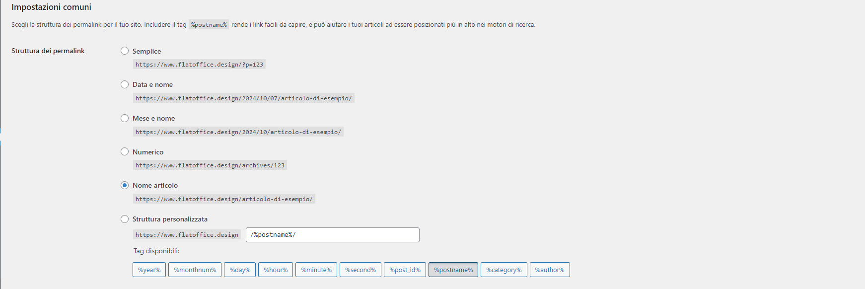 www.tuosito.it/archives/123. Anche questa non è ideale per l’ottimizzazione SEO. - Nome Post: La struttura più pulita e SEO-friendly, dove l’URL include solo il nome del post, ad esempio